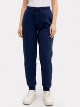Брюки изготовлены из трикотажного полотна футер. Брюки прямые с высокой посадкой. Пояс отрезной из рибаны с эластичной тесьмой внутри. В передней части пояса с лицевой стороны пробиты петли и втянут шнур. Шов втачивания пояса распошит. Спереди обработаны карманы хулиганы. По низу брюк отрезные манжеты из рибаны.