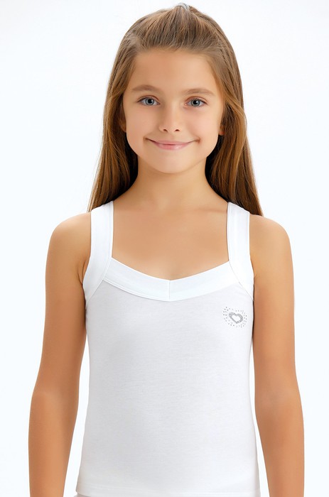 Белая майка для девочки выполнена из качественного хлопкового трикотажа. Бельевая майка полуприталенного силуэта, на широких бретелях декорирована аппликацией из стразов.