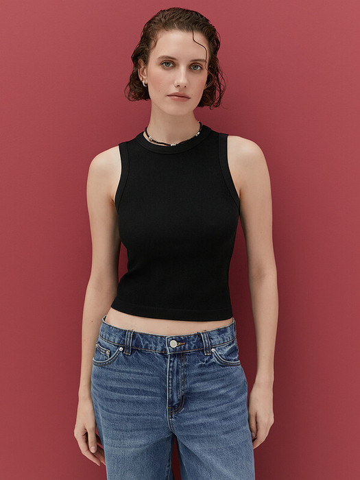 Женская майка в рубчик с вареным эффектом, круглым вырезом и широкими бретелями.