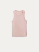 Женская майка в рубчик с вареным эффектом, круглым вырезом и широкими бретелями.