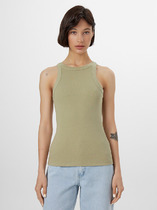 Женская майка в рубчик с вареным эффектом и декором из страз, круглым вырезом и широкими бретелями.