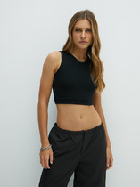 Женская майка в рубчик с вареным эффектом и декором из страз, круглым вырезом и широкими бретелями.