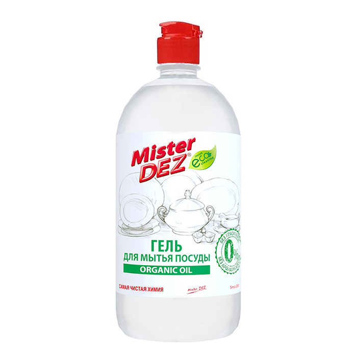 Гель для мытья посуды Mister Dez ORGANIC OIL 1л содержит экологически чистые моющие компоненты из натурального сырья.