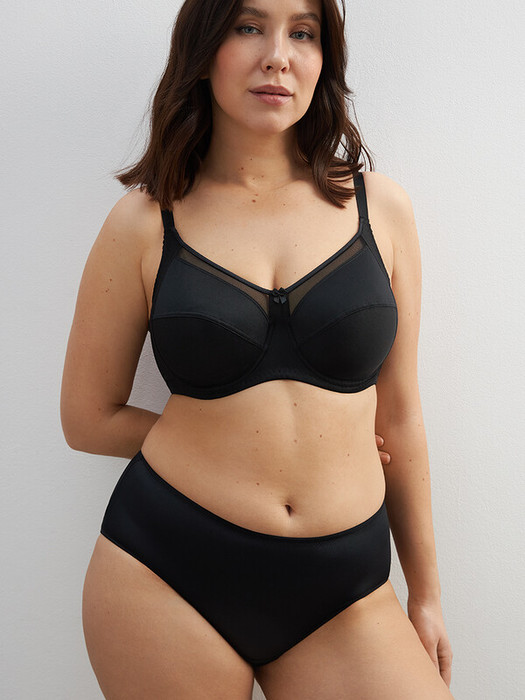 Бюстгальтер с мягкой чашкой и  боковой корректирующей деталью, на каркасах. Внутренняя деталь чашки дублирована хлопком. Высокая центральная деталь усиливают поддержку груди. Бюстгальтер выполнен из трикотажного полотна трилобал*, верхний край чашки декорирован сеткой.