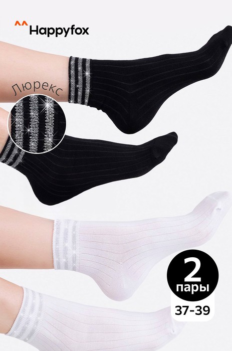 Набор женских носков из 2 пар выполнен из нежного хлопкового трикотажа. В комплекте черные и белые носки в рубчик. Блестящие полоски из люрекса добавляют изысканности.