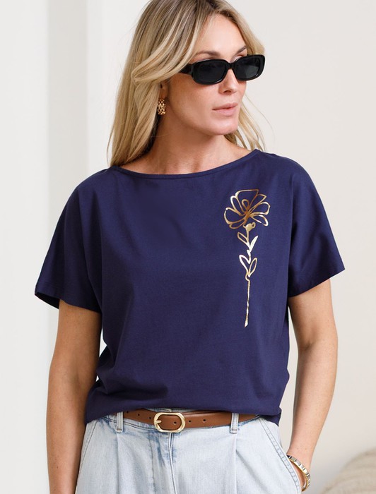 Состав: 92%Хлопок 8%ПУ Плотность: 150 Г/м2Футболка темно-синего цвета идеально подходит для вечеринки и создания яркого образа. Оригинальный блестящий принт из фольги в виде цветка придает изделию шикарный вид, который привлечет внимание на любом мероприятии. Модель с вырезом лодочка и цельнокроеным рукавом обеспечивает свободу движений и комфорт в носке. Такой фасон изделия подходит на большие размеры, гармонично сидит на фигуре и помогает создать легкий акцент на достоинствах. Благодаря особенностям кроя с цельнокроеным рукавом удается искусно скроет любые возможные недостатки в области плеч и рук, обеспечивая комфортное прилегание без ощущения скованности. Аккуратный вырез лодочка красиво подчеркивает шею и делает образ элегантным, сохраняя актуальность для разных случаев — от рабочих встреч до вечерних прогулок и праздничных мероприятий.