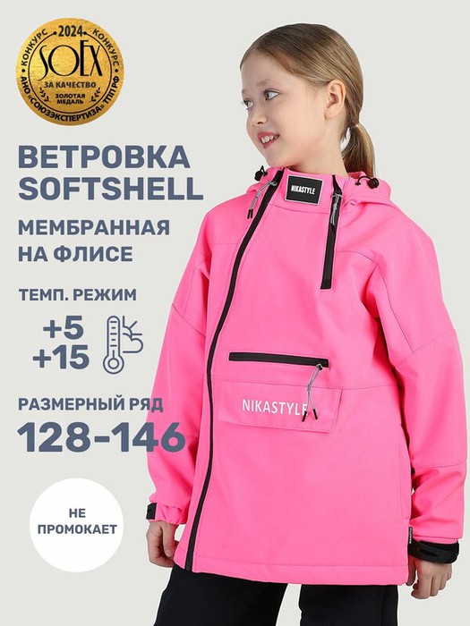 Ветровка для девочки СКАЙЛАЙН из Softshell идеально подходит активным детям на прогулках, которые много двигаются и не сидят на месте. Softshell это инновационный материал нового поколения, внешний слой которого защищает от влаги и ветра, внутренний слой из флиса сохраняет тепло и отводит лишнюю влагу, а промежуточный мембранный слой имеет хорошую паропроницаемость и позволяет коже дышать. Softshell приятный на ощупь, легкий и эластичный материал, не сковывающий движения ребенка.Функционал: - смещенная центральная застежка с влагоотталкивающей молнией и дополнительная боковая молния,- ветрозащитная планка, - центральный карман на молнии и нижний карман в левом боковом шве на кнопке, - капюшон с кулисой для регулировки объема. Мы все продумали до мелочей, поэтому модель оснащена кулисой по низу для регулировки объема изделия и манжетами на резинке с дополнительной регулировкой для защиты от проникновения холодного ветра.Когда носить? Весной и осенью с теплой поддевой, а также прохладным летом.Температурный режим от +5°С до +15°С.Уход за изделиями из Softshell аналогичен уходу за изделиями из мембранной ткани и достаточно прост — большинство загрязнений легко удаляются влажной салфеткой или щеткой с водой. Возможна машинная стирка при 30°С с использованием жидких средств для мембранной ткани. Отжим на минимальных оборотах, сушка на вешалке в расправленном виде.