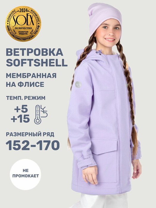 Ветровка для девочки ДЖУНИОР из Softshell идеально подходит активным детям на прогулках, которые много двигаются и не сидят на месте. Softshell это инновационный материал нового поколения, внешний слой которого защищает от влаги и ветра, внутренний слой из флиса сохраняет тепло и отводит лишнюю влагу, а промежуточный мембранный слой имеет хорошую паропроницаемость и позволяет коже дышать. Softshell приятный на ощупь, легкий и эластичный материал, не сковывающий движения ребенка.Функционал: - центральная застежка на молнии, - ветрозащитная планка, - накладные карманы с клапанами на кнопках, - капюшон с кулисой для регулировки объема. Мы все продумали до мелочей, поэтому модель оснащена резинкой на спинке для приталенного силуэта и манжетами с регулировкой длины для защиты от проникновения холодного ветра.Когда носить? Весной и осенью с теплой поддевой, а также прохладным летом.Температурный режим от +5°С до +15°С.Уход за изделиями из Softshell аналогичен уходу за изделиями из мембранной ткани и достаточно прост — большинство загрязнений легко удаляются влажной салфеткой или щеткой с водой. Возможна машинная стирка при 30°С с использованием жидких средств для мембранной ткани. Отжим на минимальных оборотах, сушка на вешалке в расправленном виде