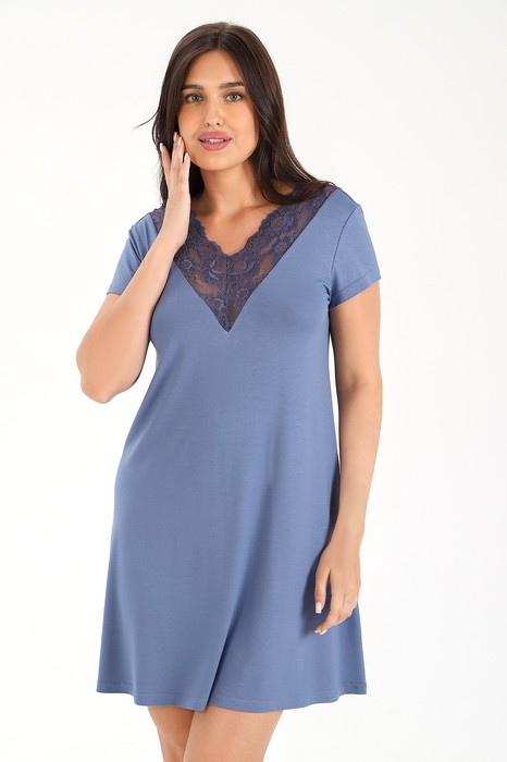 Сорочка из гладкокрашеного вискозного трикотажного полотна, слегка расширенная книзу, с короткими втачными рукавами. Полочка и спинка – с V – образными кружевными деталями по горловине.