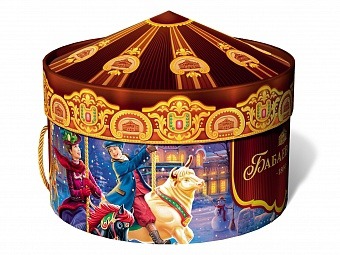 Конфеты упакованы в нарядную картонную коробку с ручкой и рисунком карусели.
