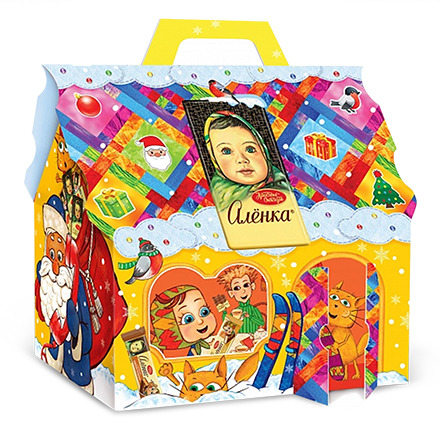 Новогодний подарок «Алёнка веселые каникулы» - это пестрый теремок из картона, полный отборных сладостей от бренда «Алёнка»: конфеты, бисквиты, шоколад и даже немножко карамели – настоящая находка для поклонников девочки в платочке.