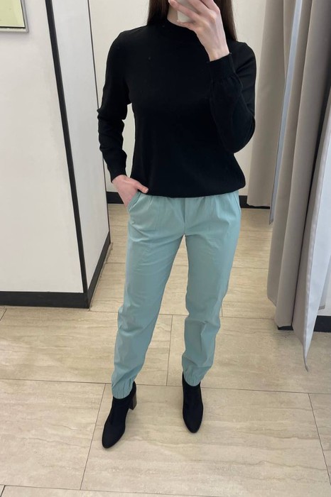 Брюки из легкой костюмной ткани, чуть зауженные книзу. На передней части брюк имитация гульфика, декоративные подрезы и карманы. Пояс с эластичной резиной. Низ брюк на резинке.