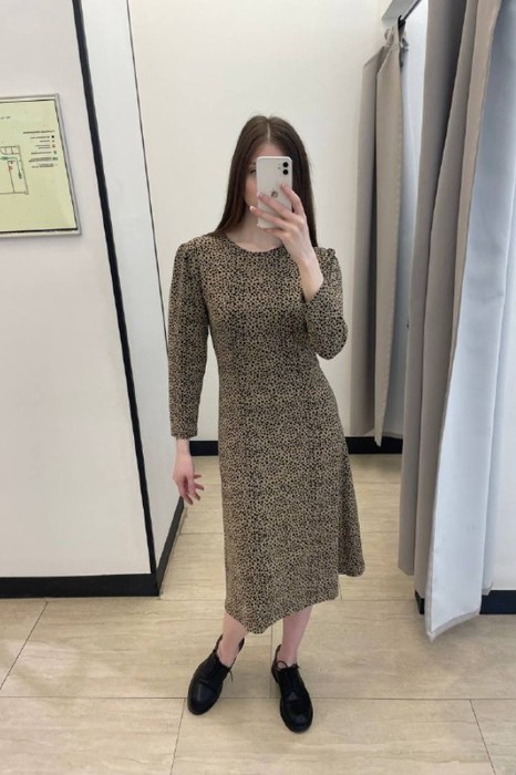 Платье отрезное по линии талии из эластичного полотна с жаккардовым анималистичным узором. Лиф, прилегающий с центральным швом на передней части и круглым вырезом горловины. Укороченный втачной рукав со сборкой по окату. Юбка летящего силуэта. На спинке платья выполнена застежка на молнию.