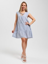 Платье свободного силуэта, расширенное книзу из вискозной плательной ткани. Низ изделия асимметричной длины (спинка чуть удлинена относительно переда). V-образный вырез горловины с декоративной завязкой. Втачной рукав со сборкой по окату и низу рукава. Асимметричный низ рукава и вырез горловины окантованы косыми бейками. В комплекте пояс из основной ткани.