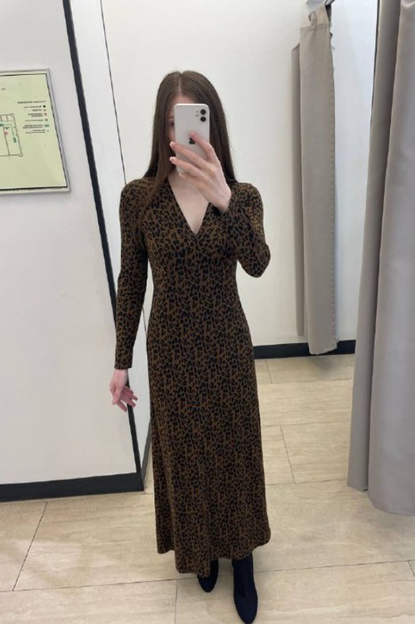 Платье полуприлегающего силуэта, расширенное книзу из эластичного полотна с жаккардовым узором. Боковые швы смещены в сторону переда. На передней части, ниже линии груди, выполнены рельефы. Линия рельефа начинается от выреза горловины и заканчивается в боковом шве на уровне выше линии талии. V- образный вырез горловины. Спинка со средним швом и талиевыми вытачками. Втачной длинный рукав.