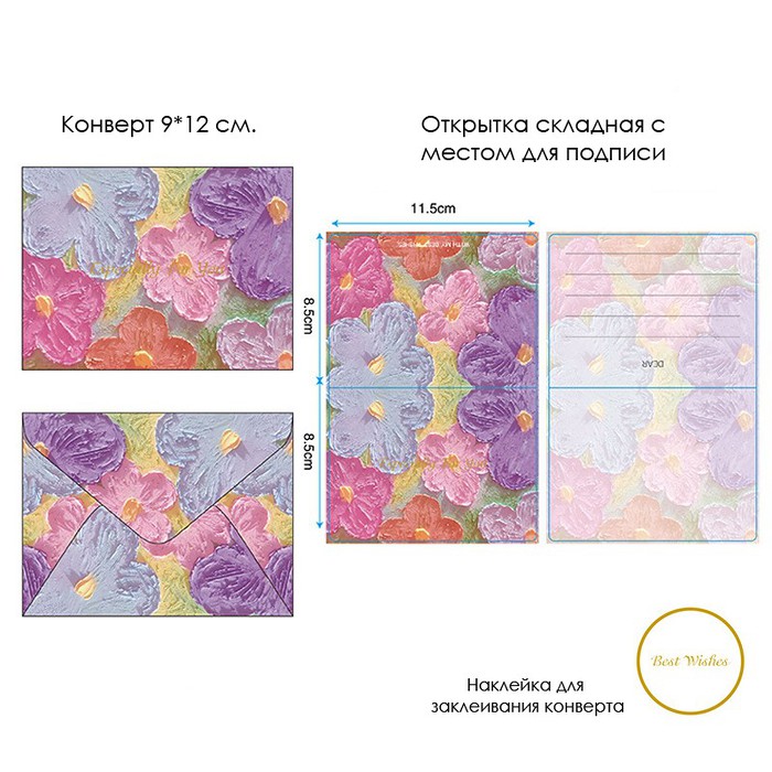 Открытка дополнена белым конвертом с наклейкой и упакована в индивидуальный прозрачный пакетик.Внутри есть место для того, чтобы вы написали пожелание.