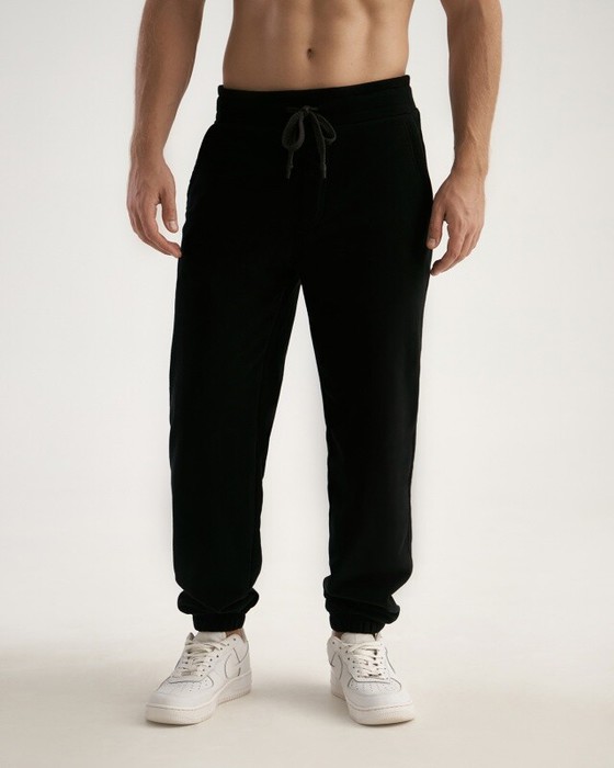 Мужские брюки, джоггеры с резинкой по низу брюк. Пояс из 2-х деталей, внутри резинка. По поясу отстрочка, петли,шнур. Боковые карманы с двойной отстрочкой, боковые швы отстрочены. Задний карман на правой задней половинке брюк.