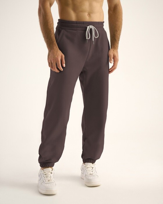 Мужские брюки, джоггеры с резинкой по низу брюк. Пояс из основной ткани, внутри резинка,со шнурком. По поясу отстрочка, петли. Боковые карманы, боковые швы отстрочены.