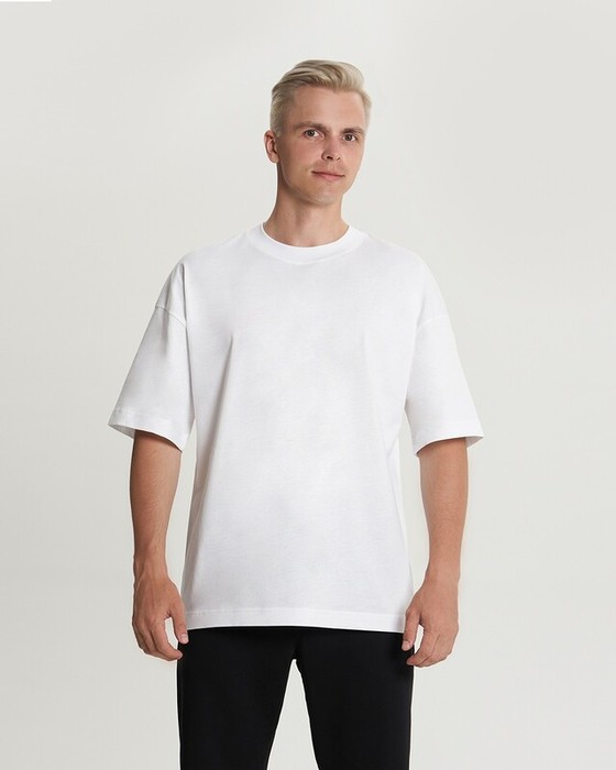 Футболка свободного силуэта. Спущенное плечо. Горловина из двух деталей, из рибаны.