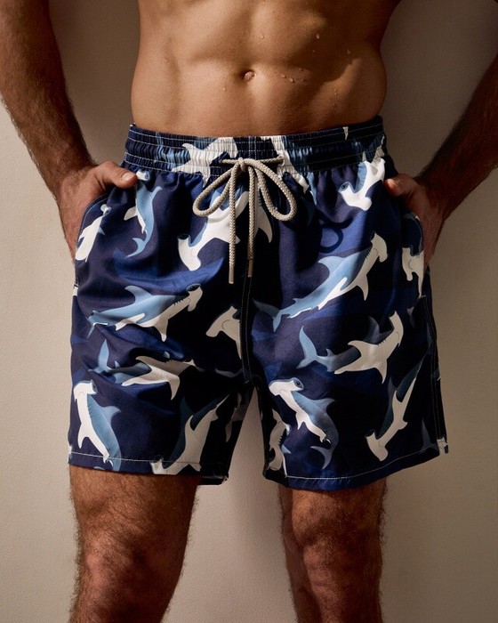 Плавательные шорты. Карманы в боковых швах. Задний карман с клапаном на правой задней половинке шорт. Пояс цельнокроенный, отстроченный, внутри с резинкой и шнурком.
