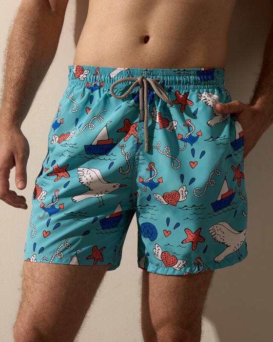 Плавательные шорты. Карманы в боковых швах. Задний карман с клапаном на правой задней половинке шорт. Пояс цельнокроенный, отстроченный, внутри с резинкой и шнурком.