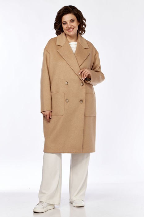 Пальто женское, свободного кроя с двухбортной застежкой на петли ипуговицы, с открытыми бортами,линия плеча спущена. По спинке средний шов, по переду накладные карманы. Рукав втачной 2-шовный. Воротник стояче-отложной.