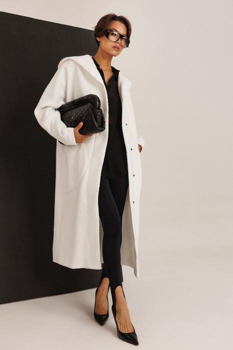 Пальто женское прямого силуэта из искусственного меха под каракуль, на подкладке. Рукав цельнокроенный с притачной манжетой. На переде настрочены накладные карманы полукруглой формы. Край борта обработан подбортом, из которого сформирована имитация планки. Спинка прямая. Горловина обработана капюшоном. По краю капюшона в продолжении имитации планки проложена отделочная строчка. Застежка на пришивные кнопки. В местах пришивания кнопок выполнены фиксирующие закрепки.