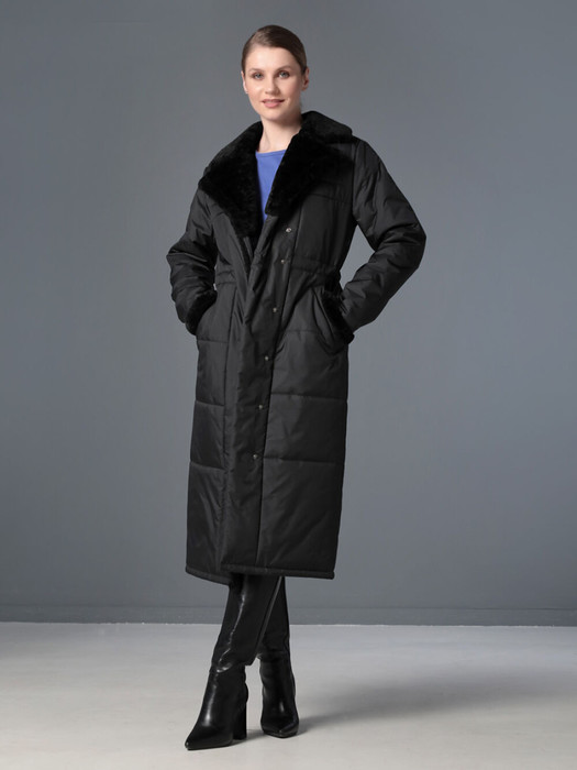 Стильное длинное пальто прямого силуэта с ассиметричной  застежкой на кнопки. Это демисезонное пальто подходит для женщин и девушек любого возраста. Свободный силуэт можно легко изменить с помощью внутренней кулиски, подчеркнув тем самым линию талии.  Воротник - по типу "английского" с возможностью фиксации лацкана на пуговицу. Удобно расположенные прорезные карманы  застегиваются на кнопку. Низ втачного рукава, край борта и воротник с лацканами выполнены из мягкого эко-меха, который хорошо стирается на рекомендованном режиме и не меняет свой внешний вид после высыхания. Плащевая ткань имеет водоотталкивающую пропитку,  которая выдержит небольшой осенний дождь или снег. Хорошо зарекомендовавший себя утеплитель Холлофайбер плотностью 150 гр/м защитит от холода и  ветра. Подкладка в изделии - в мелкую полоску. Выбирайте понравившийся цвет, подбирайте аксессуары, и Ваша осень будет стильной и комфортной!