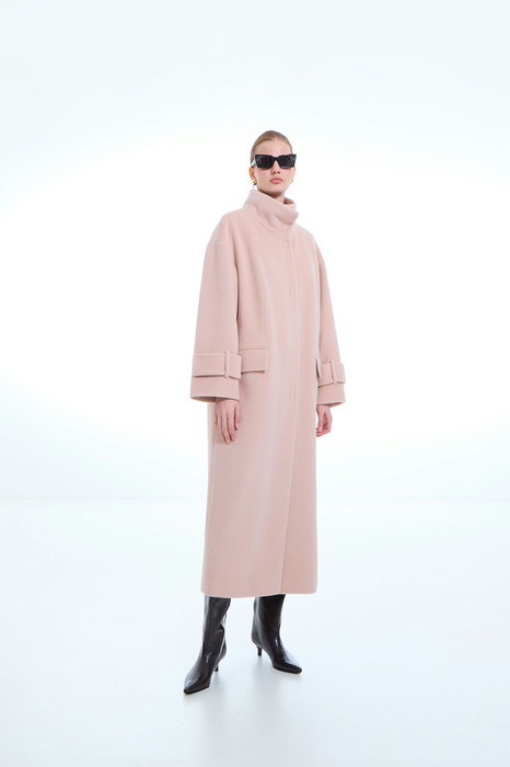 Пальто женское демисезонное прямого силуэта, на подкладке, длиной ниже колена, однобортное. На переде застежка по борту и воротнику-стойке на пришивные кнопки, карманы-клапан с двумя обтачками. В нижней части среднего шва спинки-шлица. Рукав втачной со спущенный плечом, в нижней части пата, вдета в шлевку.