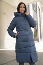 Пальто женское плащевое утепленное прямого силуэта, двубортное, длиной ниже колена, на подкладке. Застежка на пробивные потайные кнопки. Перед c карманами листочка, застегивающимися на потайную кнопку. Рукав длинный, двухшовный. Пальто с капюшоном и «манишкой» с застежкой на молнии, из плащевой ткани, стеганой на утеплителе ISOSOFT 200г.