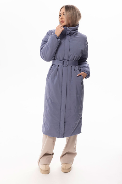 Пальто утепленное, с центральной застежкой на молнию, с высоким воротником- стойкой, планкой, застегивающейся на кнопки. На полочках расположены прорезные карманы с листочками. Рукав втачной, с отрезной манжетой. Манжета присборена на резинку. Плечо спущенное. Пальто со съемным поясом.