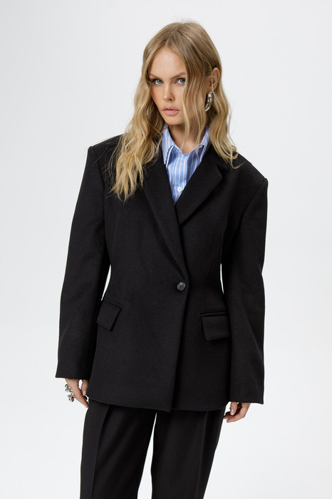 Детали: полуприлегающий силуэт, расширенные плечи, пиджачный воротник, талиевые вытачки переда и спинки, застежка на петли и пуговицы, функциональные карманы, на подкладке.