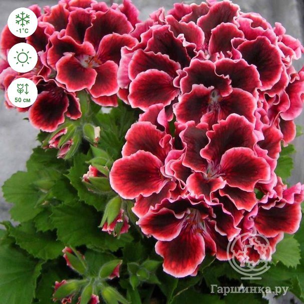 это сорт раннего продолжительного цветения. Цветки крупные, бордовые с белой каймой и волнистыми краями, диаметром 5-6 см. Листья однородного зеленого цвета. Сорт устойчив к заболеваниям и вредителям, а также не требует особого ухода.