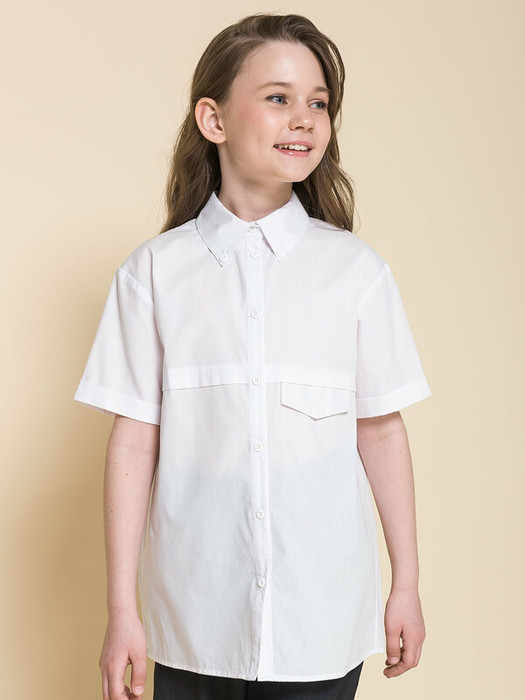 Школьная блузка прямого силуэта для девочки. Преобладающий в составе ткани хлопок делает эту модель мягкой, дышащей и комфортной для ребёнка. Благодаря полиэстеру изделие сохраняет форму и превосходный внешний вид. На спинке кокетка с защипом - свобода движения, комфорт в течение дня.  По переду под кокеткой имитация кармана в виде декоративного клапана – актуально и стильно. Воротник украшают декоративные пуговицы — изюминка модели. Рукав с отворотом - оригинально. Практичная и универсальная модель благодаря лаконичному дизайну великолепно сочетается с различными брюками и юбками. Отличный вариант детской блузки для школы.