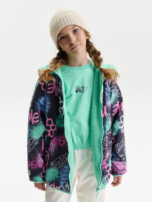 Куртка для девочки имеет современный свободный крой оверсайз и укороченную длину до подъягодичной складки. Покрой рукава реглан формирует мягкую линию плеча, а объёмный верх рукава с заужением к низу обеспечивает свободу движений. Низ изделия и рукава окантованы эластичным пайпингом и слегка собраны, что помогает защититься от ветра.