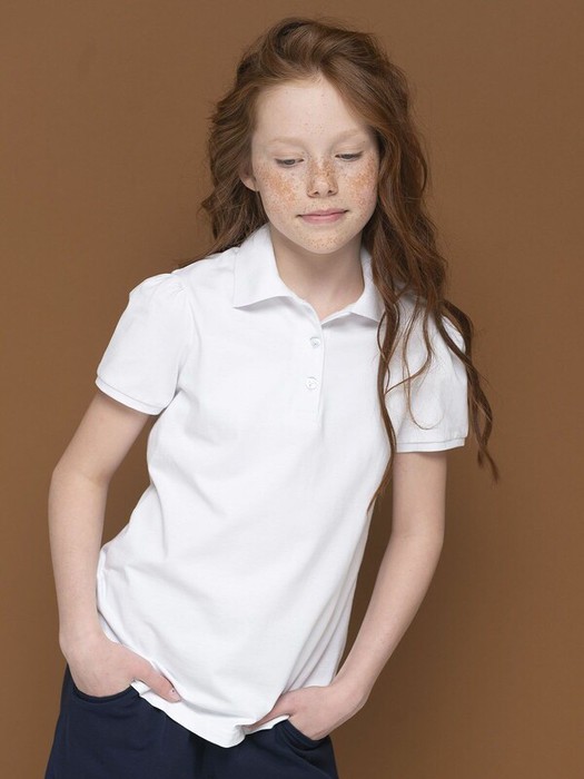 Футболка-поло стильная базовая вещь в гардеробе школьницы. Приятный к телу мягкий хлопковый трикотаж позволяет коже дышать, а добавленный в состав эластан улучшает износостойкость изделия. Футболка-поло отличный вариант в качестве самостоятельной единицы образа и прекрасное дополнение к более плотному джемперу, свитеру или кардигану. Втачной отложной воротник имеет специальное плетение, чтобы деталь не мялась и сохраняла форму. Спереди изделие застегивается на три пуговки, которые несут в себе скромный, но привлекательный акцент в виде маленьких страз.
