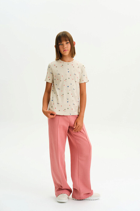 Очаровательная футболка для девочки из трикотажа кашкорсе — мягкая, эластичная и приятная к телу. Ткань в рубчик отлично тянется, сохраняет форму и обеспечивает комфорт на весь день.