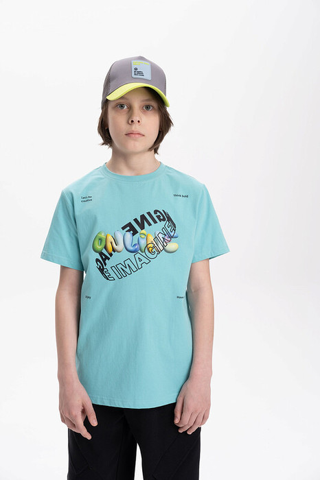 Футболка для мальчика прямого кроя - это идеальный выбор для активного ребенка. Вырез горловины обработан эластичной тканью — она прекрасно держит форму, не растягивается, при этом ребёнку удобно надевать и снимать футболку. Изделие неприхотливо в уходе. Футболка летняя с принтом и надписями в стиле Digital. Перевод надписей: "let's be creative" - будь креативный,  "think bold" - думай смелее, "enjoy" - наслаждайся, "have fun" - веселись.Яркая спортивная футболка подходит как для подростков так и для малышей в детский сад. Подходит для любого времени года.