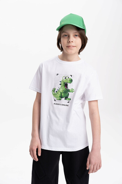 Футболка для мальчика прямого кроя - это идеальный выбор для активного ребенка. Вырез горловины обработан эластичной тканью — она прекрасно держит форму, не растягивается, при этом ребёнку удобно надевать и снимать футболку. Изделие неприхотливо в уходе. Футболка летняя с принтом по переду в виде диноавра и надписями в стиле Digital. Перевод надписей: "always online" - всегда онлайн. На спине - текстовый принт, перевод текста: "energy, supercharge, power-ups, coolest 100%" - энергия, заряд, сила, крутость. Яркая спортивная футболка подходит как для подростков так и для малышей в детский сад. Подходит для любого времени года.