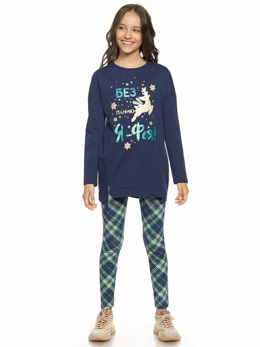 Комплект для девочек. Туника О образного силуэта с перепадом длин между передом и спинкой, спущенное плечо, боковые швы переведены на перед, оканчиваются небольшими разрезами. Принт в виде пряничного оленя, с золотом, бирюзовым глиттером и металликом, стразами. Классические лосины в All over принт клетку.