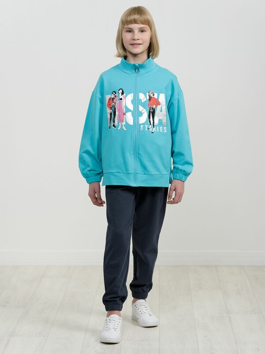 Комплект для девочек толстовка и брюки. Толстовка оверсайз силуэта. По низу изделия манжета из основной ткани с разрезами по бокам. Низ объемных рукавов заканчивается манжетой с внутренним широким эластиком. Боковые швы слегка переведены на перед. Карманы в швах. Принт фэшн стилизация графика шрифты серебряным металликом. Перевод Инста сторис. Брюки увеличенного объёма по всей длине изделия, понизу собраны на внутреннюю эластичную резину. Внутренняя регулировка пояса шнуром.