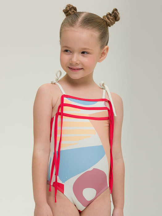 Купальник слитный для девочки. Мягкая эластичная ткань разработана специально для купальных костюмов и идеально садится по фигуре. Быстро сохнет и практически нет выгорания на солнце. Тонкие завязывающие бретели позволяют регулировать купальник по росту девочки. Разноцветный принт колорблок и яркие завязки из пайпинга - настроение лета, теплого ветерка и солнца.