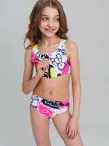 Раздельный купальник для девочек. Верх симметричный топ без регулировки объема, по переду большой волан. Лямки с регулировкой по длине. Перед продублирован подкладкой. Низ трусы с увеличенной высотой посадки. Декор боковые вставки с тремя параллельными полосками. Перед продублирован подкладкой.