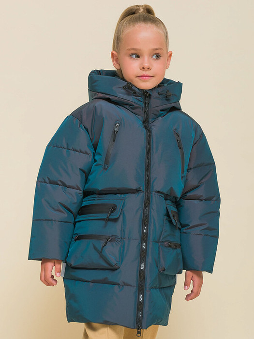 Пальто зимнее для девочки из мембранной ткани. На внешнюю поверхность материала нанесена водоотталкивающая пропитка (DWR), она задерживает грязь и влагу снаружи — ребёнок не промокнет. Также есть дополнительная пропитка на внутренней стороне ткани. Пальто трендового оверсайз-силуэта подходит для любого типа фигуры. Капюшон с двумя швами, что обеспечивает анатомически правильную форму и комфортную посадку по голове. Капюшон не отстегивается, предусмотрена регулировка объема эластичными шнурами с пластиковыми стопперами. Внутренние манжеты рукавов из эластичной рибаны (ткань в рубчик) — дополнительная защита от ветра и холода. Ширина горловины позволяет надевать свитер с объемным воротником или объёмный шарф. Верхняя часть переда и спинки имитирует надетый поверх жилет, объём которого регулируется эластиком со стопперами — оригинально и стильно. Центральная застёжка на тракторную молнию с двумя пуллерами — удобно садиться. Тканевый стоппер защищает подбородок от зажима молнией. Фиксирующая строчка предохраняет планку от «заедания» в процессе застёгивания. Куртка-пальто тёплая — дополнительно, для защиты от ветра и холода, центральная молния закрыта ветрозащитной планкой с внутренней стороны. На груди удобные прорезные карманы на молнии. Ниже накладные карманы с клапанами, на которых также есть молнии, обрамлённые водоотталкивающей рамкой (молния открывается, но кармана нет). Карманы с боковым входом закрываются на водонепроницаемую молнию со скрытыми звеньями — содержимое карманов не промокнет. Карманы внутри утеплены мягким флисом. В каждой куртке нейм-лейбл! Ребёнок не потеряется и не потеряет куртку! На спинке и в боковых швах расположены светоотражающие элементы — безопасность в тёмное время суток. За изделием легко ухаживать. Пальто стёганое без принта. Пуховик выполнен из нейлона, полиэстера и мембраны — он тёплый, не промокает, легко стирается, быстро сохнет, сохраняет отличную форму и цвет надолго. Подкладка из мягкого, тёплого и дышащего флиса (по стану, внутреннему воротнику и в капюшоне). В рукавах подкладка из полиэстера — благодаря этому ребенку легко надевать куртку, руки не путаются в рукавах. Куртка выполнена в цвете хамелеон, меняющая цвет от зеленого до черного. Её легко сочетать с разнообразными брюками, юбками, колготками. Размерная линейка: 3 (98); 4 (104); 5 (110); 6 (116); 7 (122); 8 (128); 9 (134); 10 (140); 11 (146). Пальто оверсайз подходит как для маленьких девочек дошкольного и младшего школьного возраста, так и девочек-подростков. Рекомендуемый температурный режим: не ниже минус 30 градусов. Утеплитель: экопух. В рукавах дополнительный слой тонкого синтепона. Модель идеальна для носки в детский сад, школу, для прогулок и отдыха. Зимнее пальто для девочки — отличный подарок для дочери или внучки на День рождения или любой другой праздник.