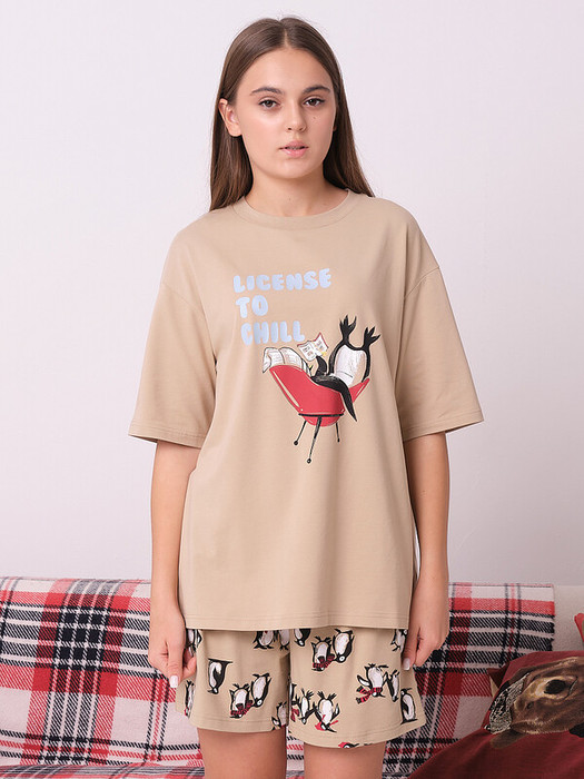Пижама женская с шортами. В составе ткани преобладает высококачественный хлопок — домашняя пижама мягкая, гипоаллергенная и хорошо пропускает воздух. В пижаме вам будет комфортно и уютно во время сна. Эластан помогает модели надолго сохранить первоначальную форму. Футболка свободная, плечо спущено, рукава широкие — в пижаме очень удобно спать. В поясе шорт мягкая и широкая резинка — не перекручивается и не давит. Отделка горловины из эластичной рибаны — она не растягивается, пижаму удобно надевать и снимать. Костюм домашний женский украшен прикольным принтом, надпись переводится: «лецензия на чилл» — поймайте позитивное настроение! Домашний комплект с шортами неприхотлив в уходе. Принты эластичные и прочные, без проблем переносит частые стирки.  Помните о правильном уходе за изделием: рекомендуется стирать при температуре не выше 30 °C, без предварительного замачивания, с изнанки. Это поможет сохранить качество и цвет пижамы на длительное время.