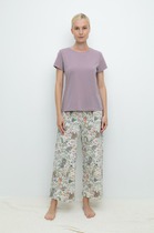 Костюм пижамный женский. В составе ткани преобладает высококачественный хлопок — комплект для сна мягкий, гипоаллергенный и хорошо пропускает воздух. В хлопковой пижаме вам будет комфортно и уютно во время сна. Эластан помогает модели надолго сохранить первоначальную форму. Свободная футболка со спущенным плечом и широкими рукавами, брюки умеренного объёма — в пижаме очень удобно спать. В поясе брюк мягкая и широкая резинка — не перекручивается и не давит. Отделка горловины из эластичной рибаны — она не растягивается, пижаму удобно надевать и снимать. Хлопковая пижама украшена милым, «няшным» принтом в виде забавных зверушек с позитивным настроением, надпись переводится: «не позволяй глупым вещам воровать твоё счастье» — почувствуйте себя беззаботной девчонкой. В принте есть модный оттенок — серебристый металлик. Пижамный костюм неприхотлив в уходе. Принт эластичный и мягкий, легко переносит частые стирки. Пижама женская с брюками подходит как для сна, так и просто для отдыха дома. Помните о правильном уходе за изделием: рекомендуется стирать при температуре не выше 30 °C, без предварительного замачивания, с изнанки. Это поможет сохранить качество и цвет пижамы на длительное время.