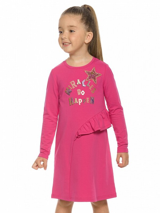 Платье для девочек из футера А силуэта. Аккуратный втачной рукав, небольшая горловина. Фишка декоративный асимметричный рельеф необычной округлой формы по переду и по спинке до низа изделия. В рельеф вставлен волан. Rubber принт с золотым металликом и глиттером. Надпись Чудеса случаются. Вуаля.