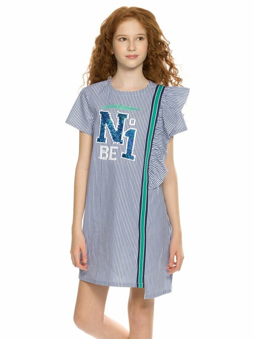 Платье для девочек. Новинка. Платье швейное из хлопка А-образного силуэта с укороченным рукавом. По левой половине изделия вертикальное членение, делящее модель по длине. Вдоль членения настрочена трикотажная декоративная тесьма и рюша из основной ткани. По спинке застежка на одну пуговицу. Декор - вышивка из переливающихся пайеток, перевод Будь первой , и художественным росчерком, перевод Делай это потрясно .