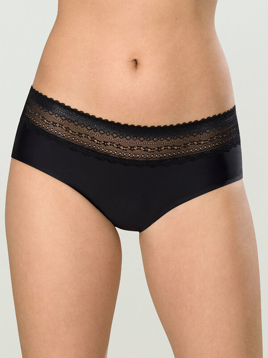 Женские трусы-шорты с низкой посадкой. Изготовлены по бесшовной технологии с минимум швов. Кромки по ноге и по талии подогнуты и приклеены, хлопковая приклеенная ластовица.  Нежное геометричное кружево по линии талии высотой 5 см – не передавливает тело и не натирает кожу.  Модель оценят те, кто ищет незаметное и невесомое белье на каждый день или особого случая.