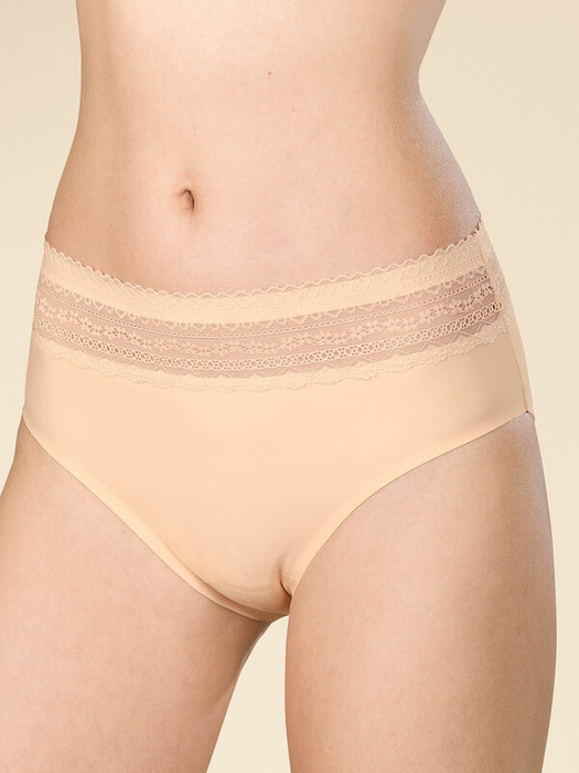 Женские трусы-слипы с высокой посадкой. Изготовлены по бесшовной технологии с минимум швов. Кромки по ноге и по талии подогнуты и приклеены, хлопковая приклеенная ластовица.  Нежное геометричное кружево по линии талии высотой 5 см – не передавливает тело и не натирает кожу.  Модель оценят те, кто ищет незаметное и невесомое белье на каждый день или особого случая.